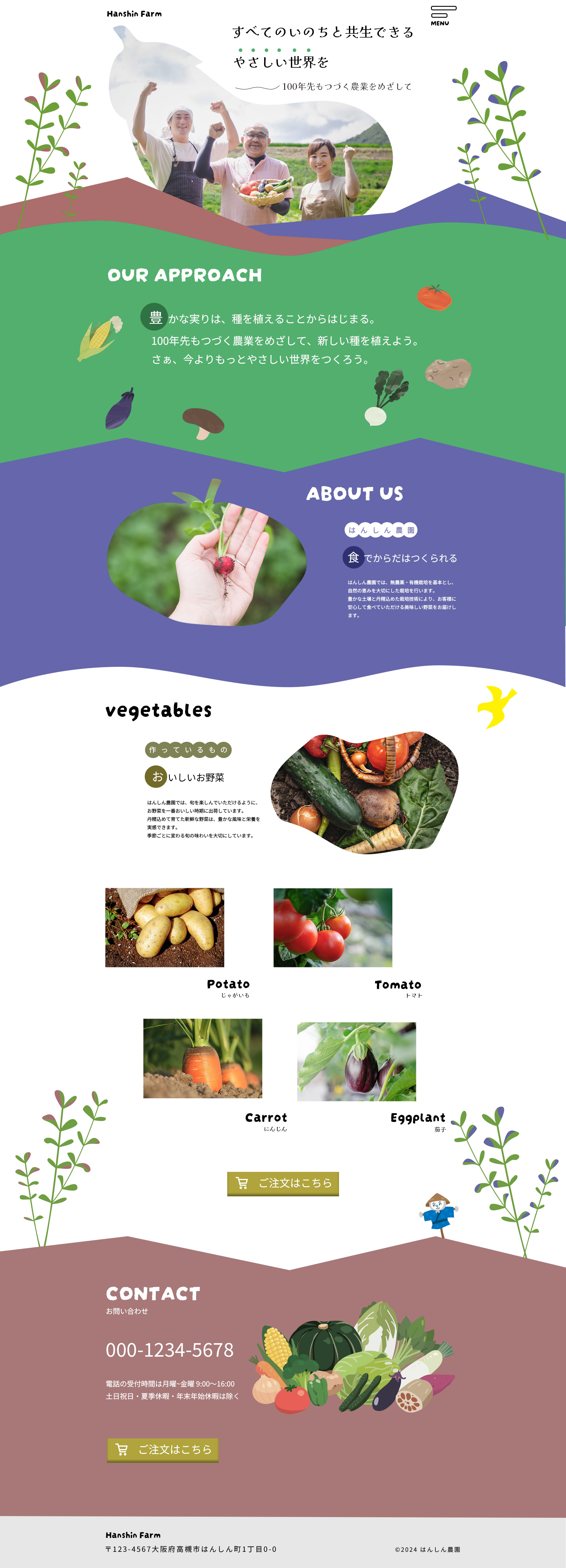 「お野菜が引き立つ色合いにしてほしい」という依頼内容だった為、トマトの赤色、茄子の紫、そして農園の緑をメインカラーに。