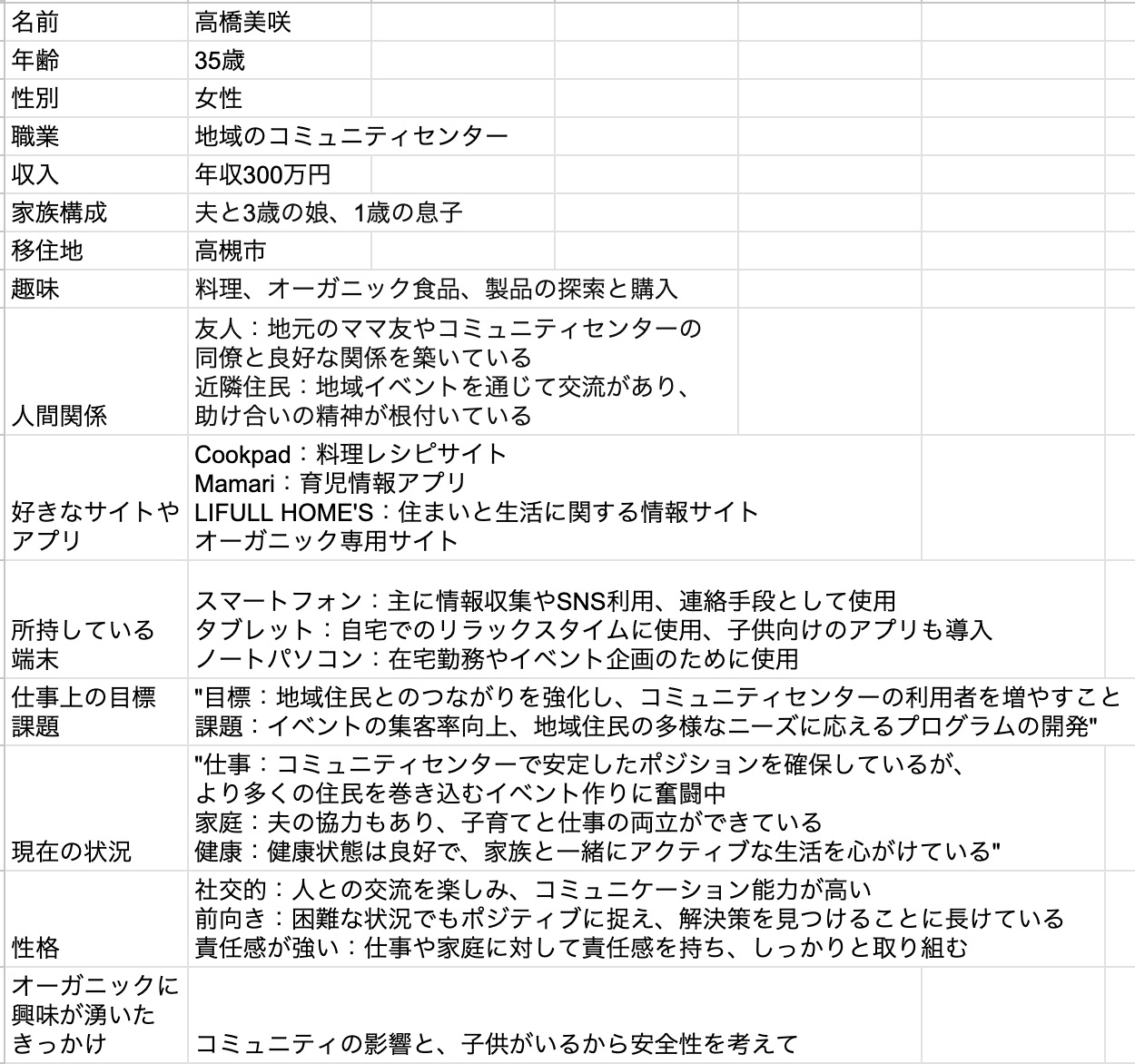 仕事で交流する中で人に勧められ、子供の健康も考え、オーガニック食品を意識するようになった。このような人物を設定しました。実際にその人物が実在しているかのような「典型的なユーザー像」になるように意識しました。