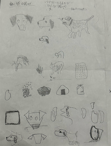 次にラフを描きました。犬とお米2つのモチーフを手書きで自由に書き、そこから、様々なパターンで組み合わせたりして試行錯誤を重ねました。