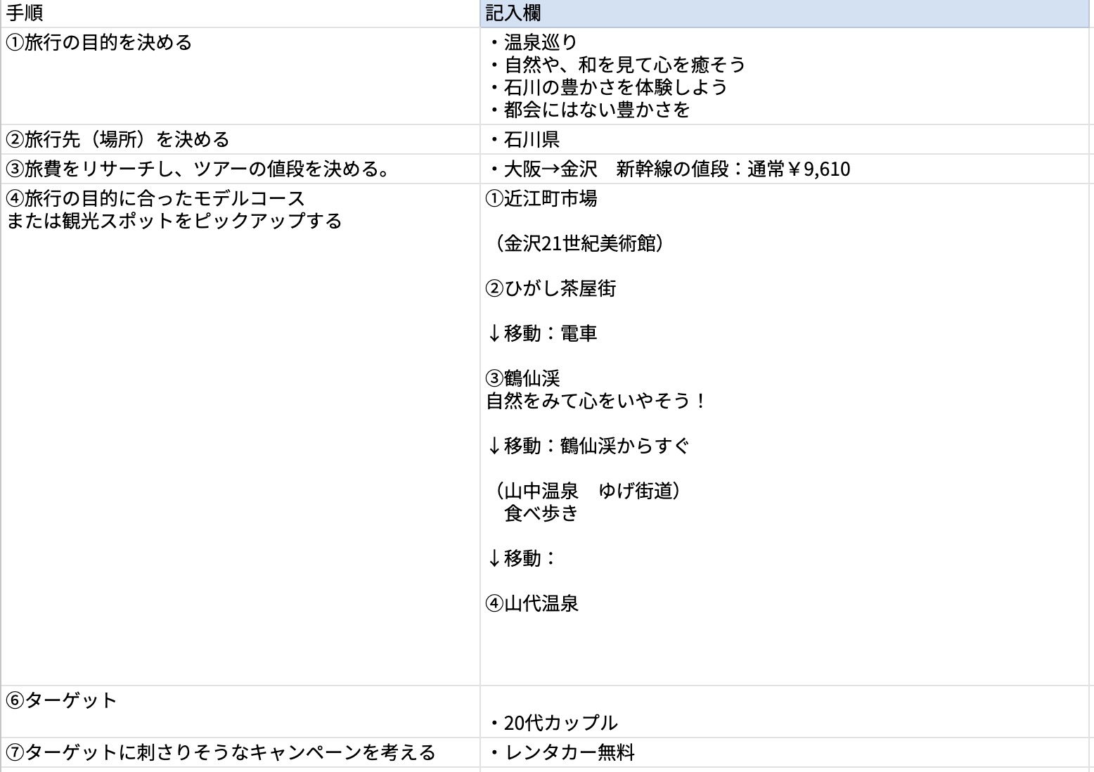 今回は旅行代理店側の気持ちになって企画(目的設定、モデルコース選定、キャンペーン考案、ターゲット設定)を考えました。まずは、大まかに旅行プランの都道府県を考えました。(今回は石川県を選びました)そこから目的に沿ってモデルコース、ターゲット、キャンペーンを考えました。